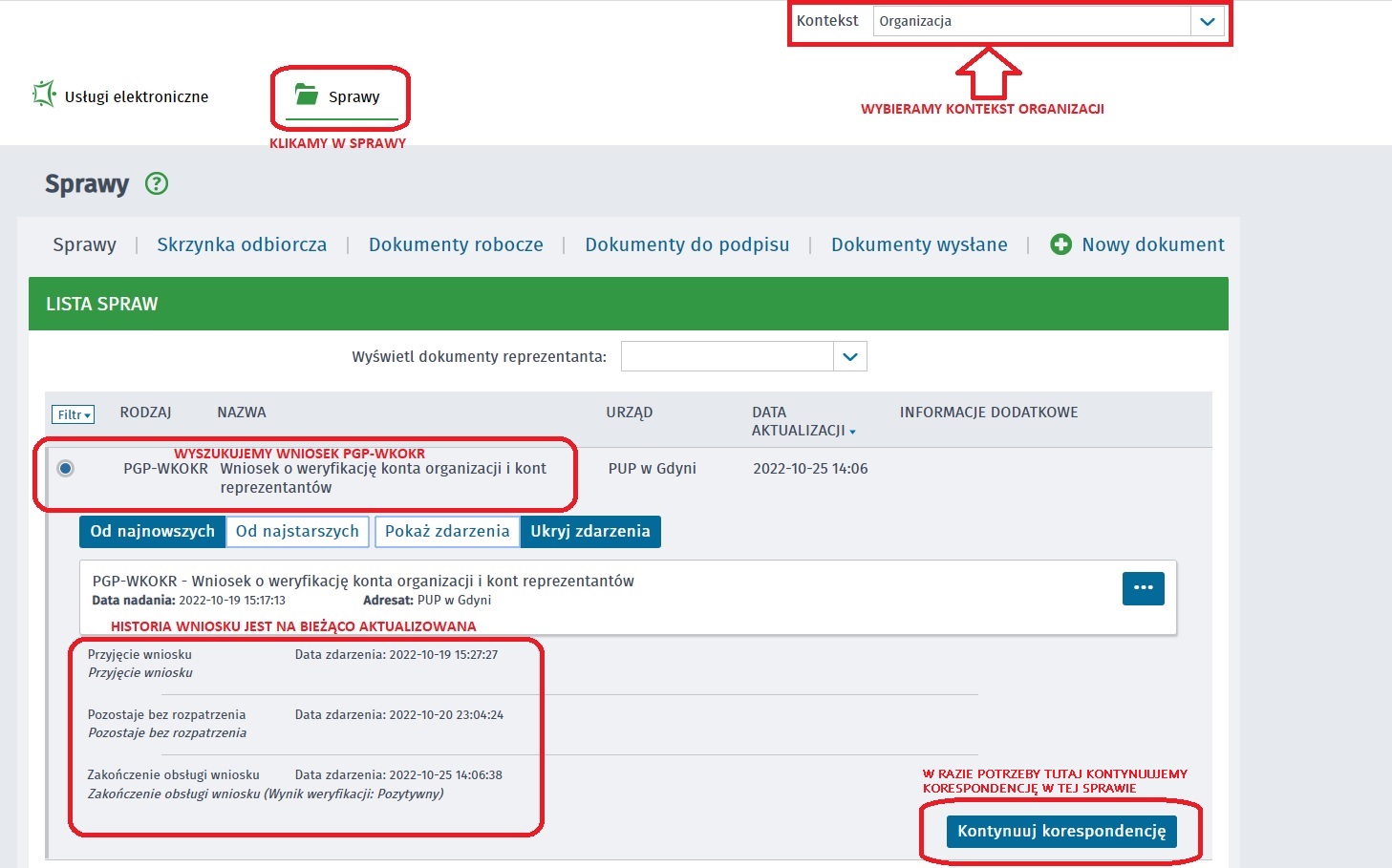 Na podstawie wniosku PGP-WKOKR złożonego przez portal praca.gov.pl pracownik Powiatowego Urzędu Pracy w Gdyni dokona weryfikacji konta organizacji oraz doda reprezentanta organizacji, co jednocześnie będzie uwidocznione w systemie praca.gov.pl. W celu sprawdzenia statusu złożonego wniosku należy wybrać organizację za pomocą pola „Kontekst" oraz wejść w zakładkę sprawy – stan spraw.