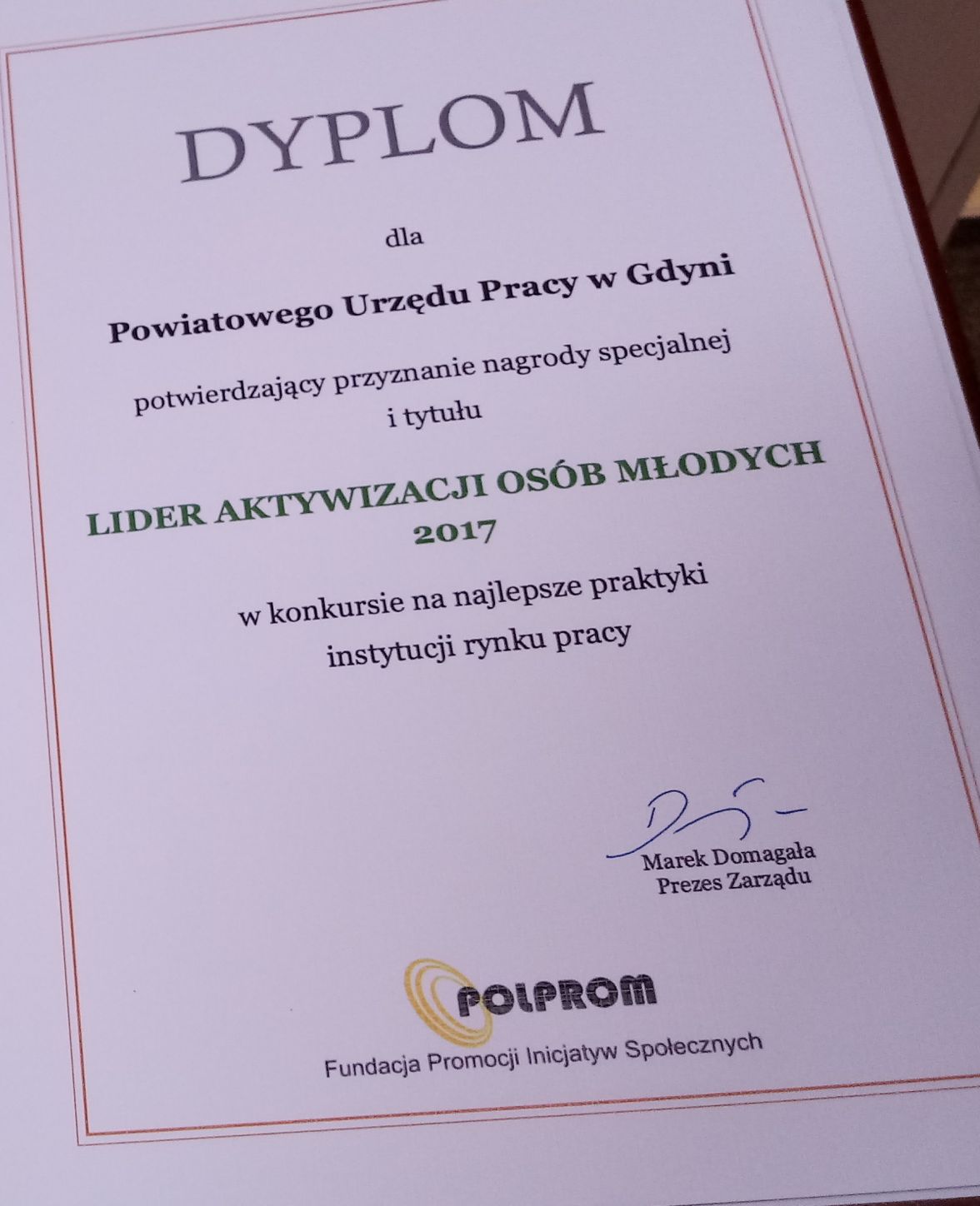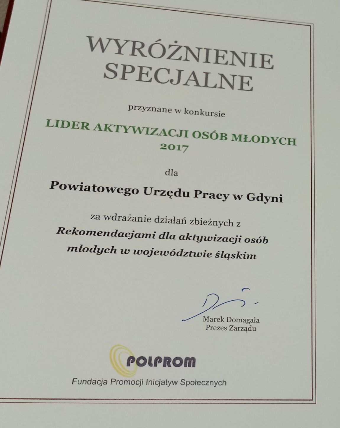 Powiatowy Urząd Pracy w Gdyni zdobył nagrodę specjalną i tytuł „Lider Aktywizacji Osób Młodych" w konkursie organizowanym przez Fundację Promocji Inicjatyw Społecznych POLPROM.