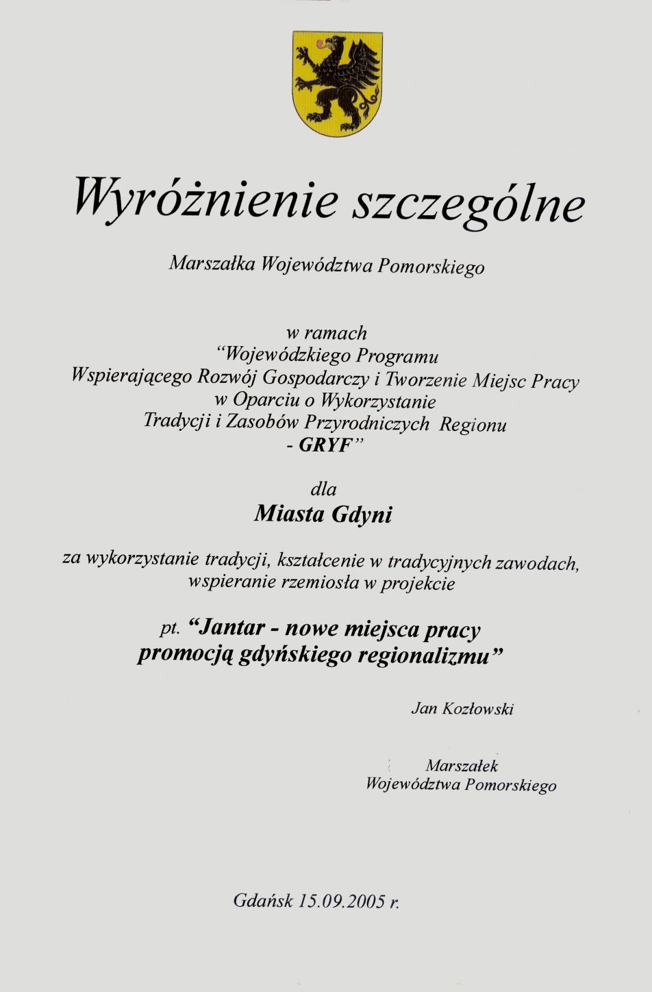 Marszałka Województwa Pomorskiego w ramach "Wojewódzkiego Programu Wspierającego Rozwój Gospodarczy i Tworzenie Miejsc Pracy w Oparciu o Wykorzystanie Tradycji i Zasobów Przyrodniczych Regionu - GRYF"