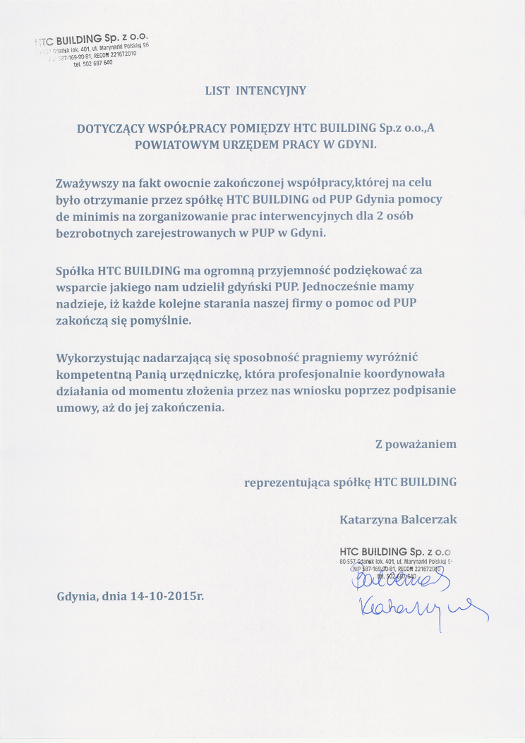 dotyczący współpracy pomiędzy HTC BUILDING Sp. z o.o. a Powiatowym Urzędem Pracy w Gdyni