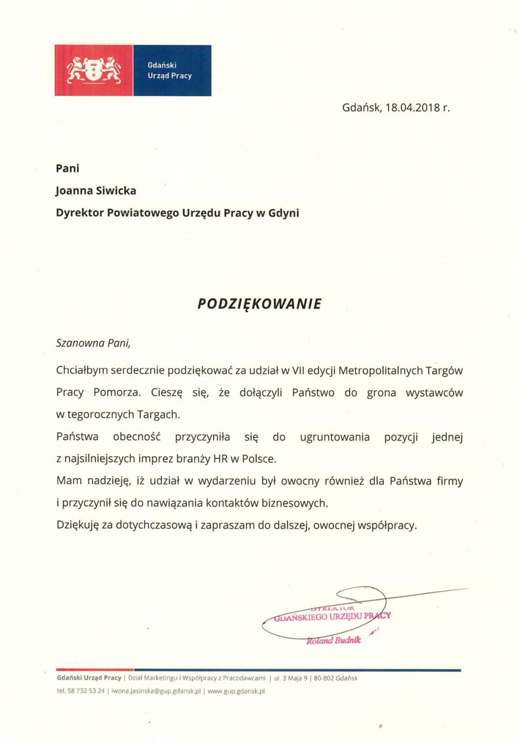 Dyrektora Gdańskiego Urzędu Pracy za udział w VII edycji Metropolitalnych Targów Pracy Pomorza
