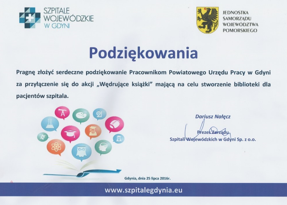 za przyłączenie się do akcji "Wędrujące książki" Szpitale Wojewódzkie w Gdyni