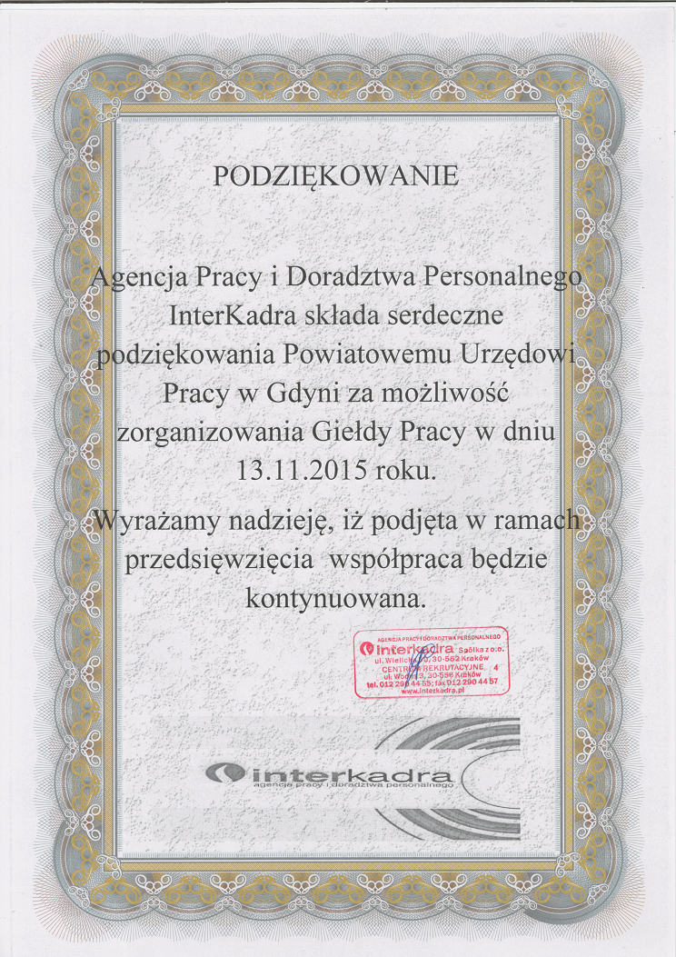 Dyrektora Gdańskiego Urzędu Pracy za udział w VII edycji Metropolitalnych Targów Pracy Pomorza